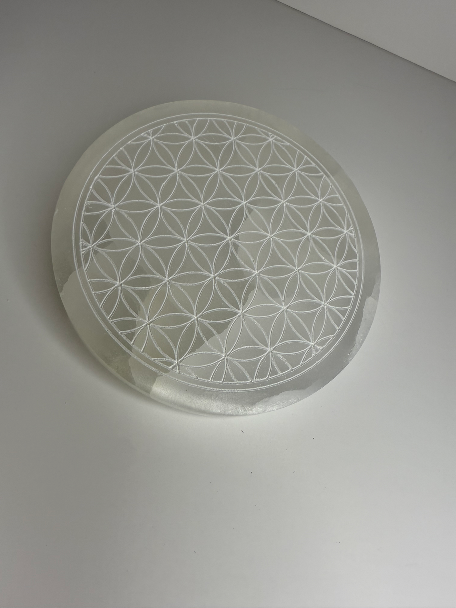 Plaque de Rechargement en Sélénite avec Fleur de Vie — Purification & Élévation